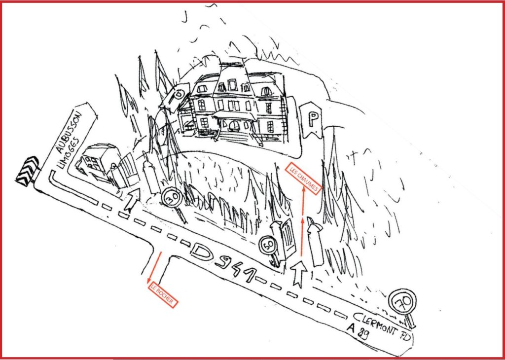 en venant de la D941 l’entrée au Rocher s’effectue chemin du Rocher, dans la montée à droite,